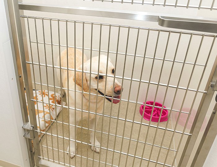 動物たちが安心できるよう、犬・猫の専用室を設けています。静かな空間設計を心がけています。また、大型犬にもくつろいでもらえるような、特別な広い入院空間を設けています。
